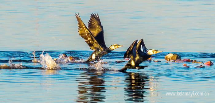 3月27日傍晚,古海生态公园(二期),一群野生鸬鹚沐浴在温暖的夕阳之下。克拉玛依融媒记者 闵勇 摄