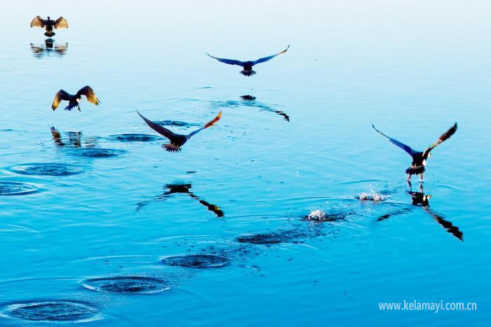 3月27日傍晚,一群野生鸬鹚飞过古海生态公园(二期)水面。克拉玛依融媒记者 闵勇 摄