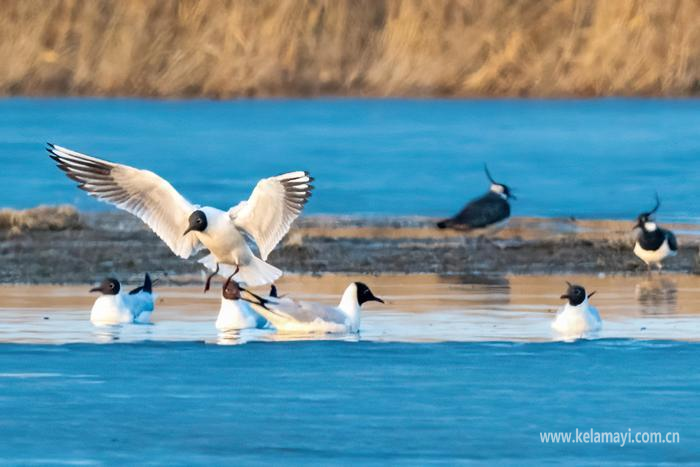 3月22日,古海生态公园(一期),一只红嘴鸥突然起飞,它周边的红嘴鸥和凤头麦鸡仍自在觅食。克拉玛依融媒记者 闵勇 摄