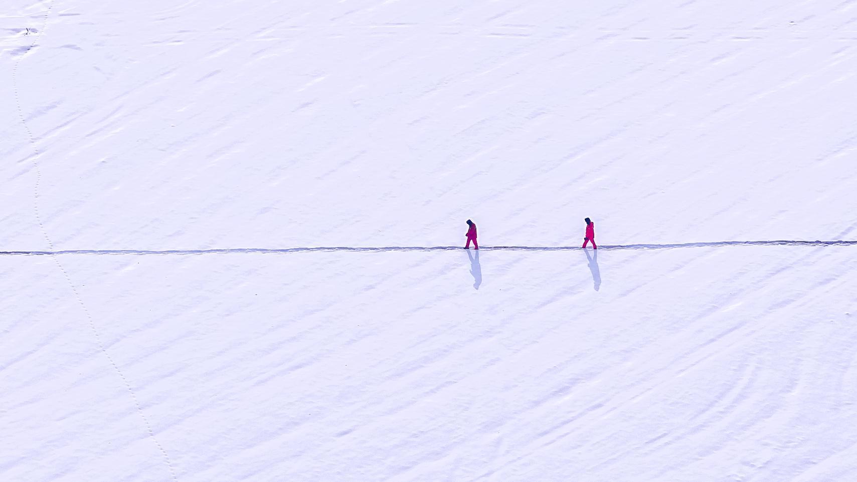 员工踏着积雪走在巡线的路上。新疆石油报记者 卢杰铭 摄