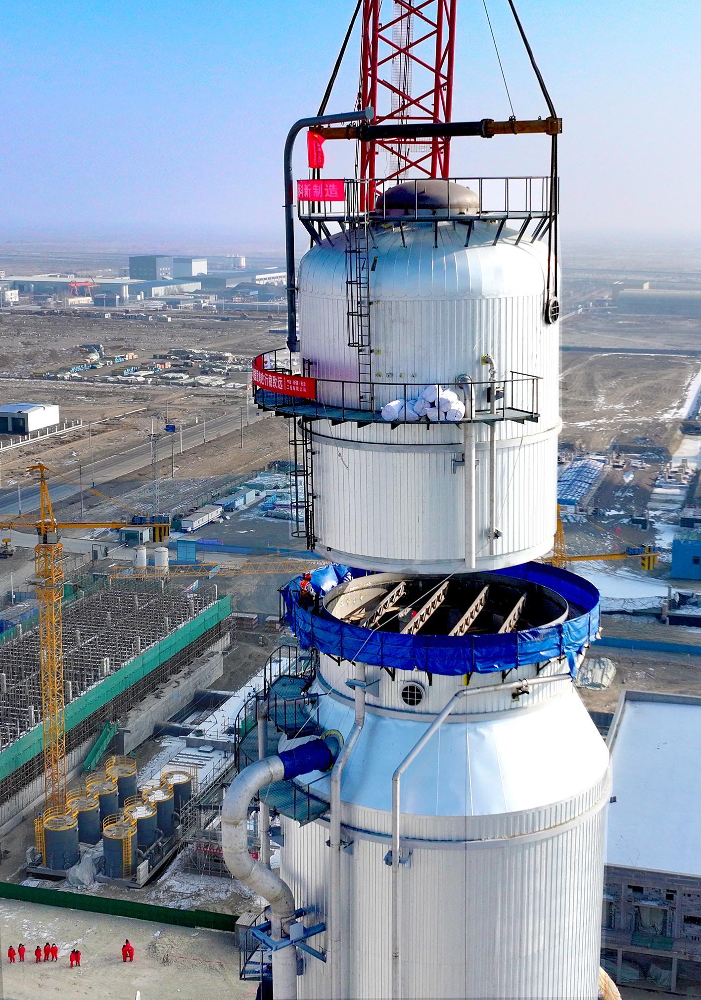 1月31日,近70米高的吸收塔因超高、超重的特点,成为整个吊装作业的最大挑战。新疆石油报记者 张珏 摄