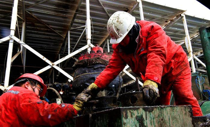 2月23日,准东钻井公司XD80501钻井队员工利用正常钻进时间保养维护泥浆泵。周建玲 摄