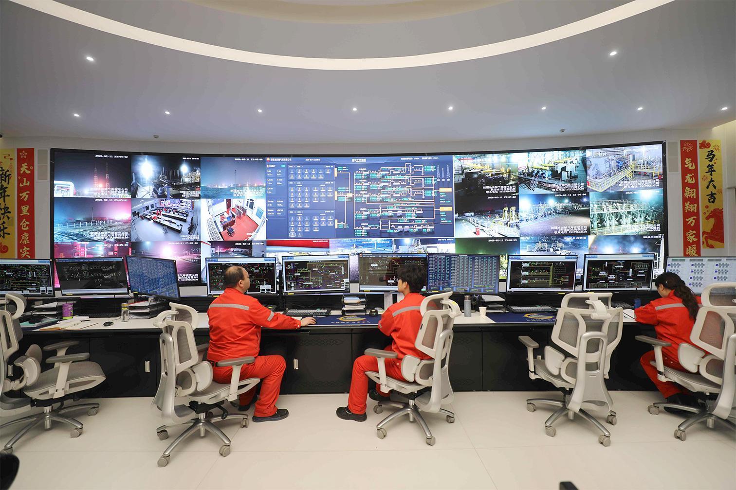储气库有限公司中控室内,技术人员正远程监控各个单井的运行气量,根据用气量的高低及时调整供气量。(图片由新疆油田公司提供)