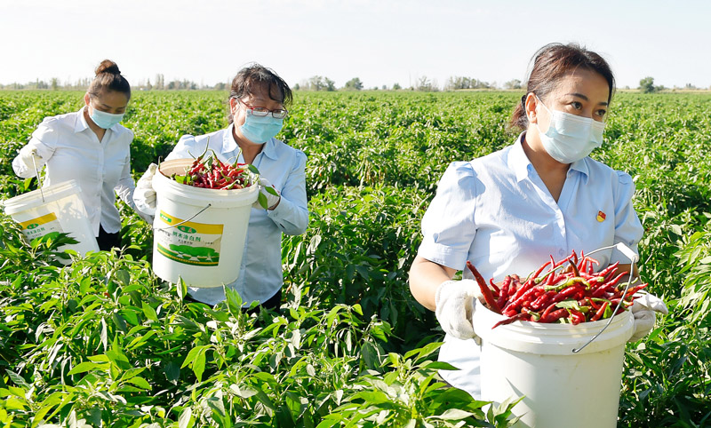 8月19日,西部绿洲公司党员在市区农业综合开发区大田里采摘辣椒。
