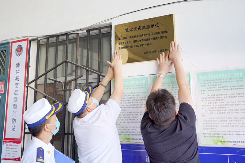 8月23日,市消防救援支队消防监督员和博峰物业公司相关负责人一同在前进小区86栋高层商住楼悬挂“重大火灾隐患单位”牌匾。