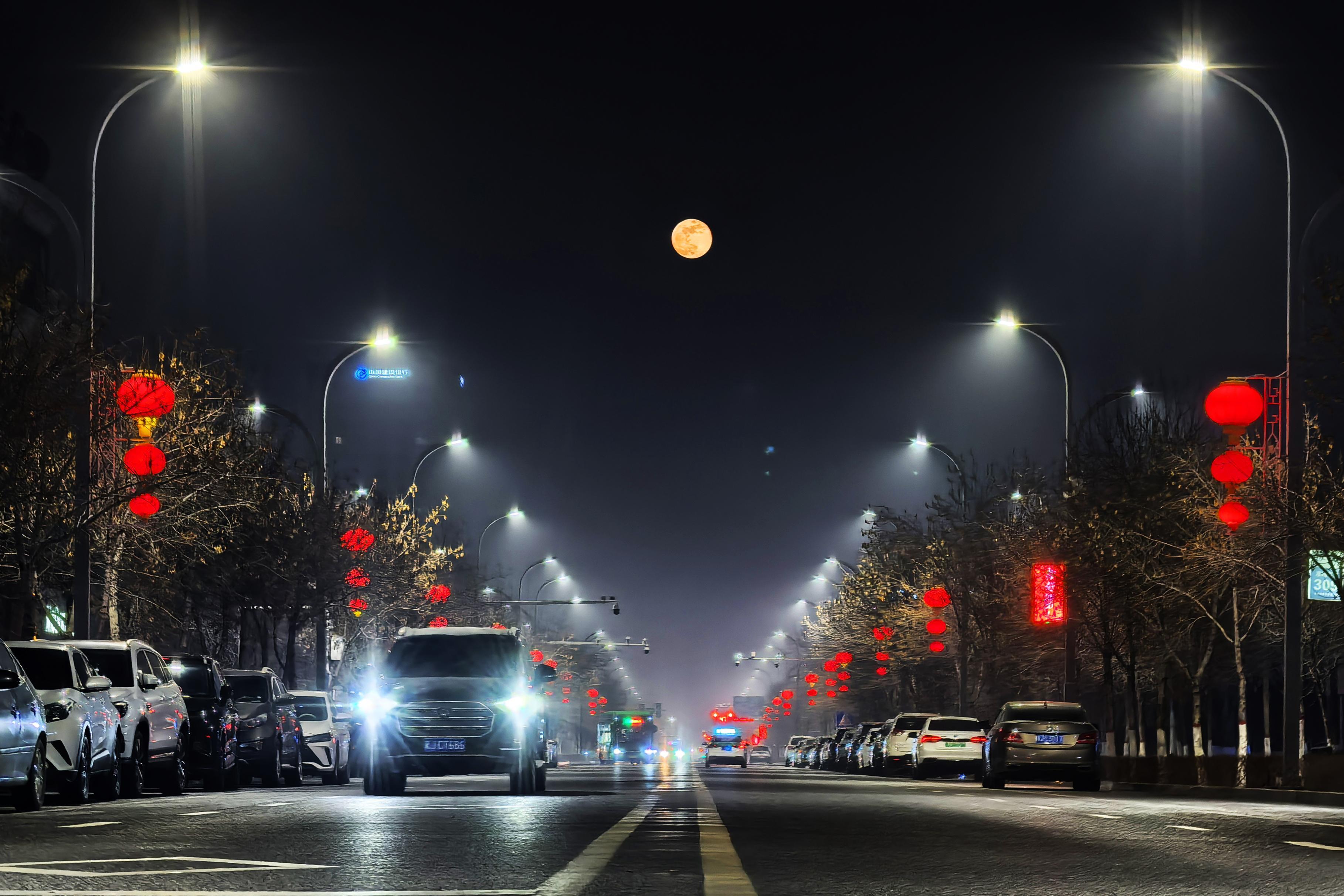 2月2日晚,被誉为“雪月”的年度第二轮满月现身市区准噶尔路上空。