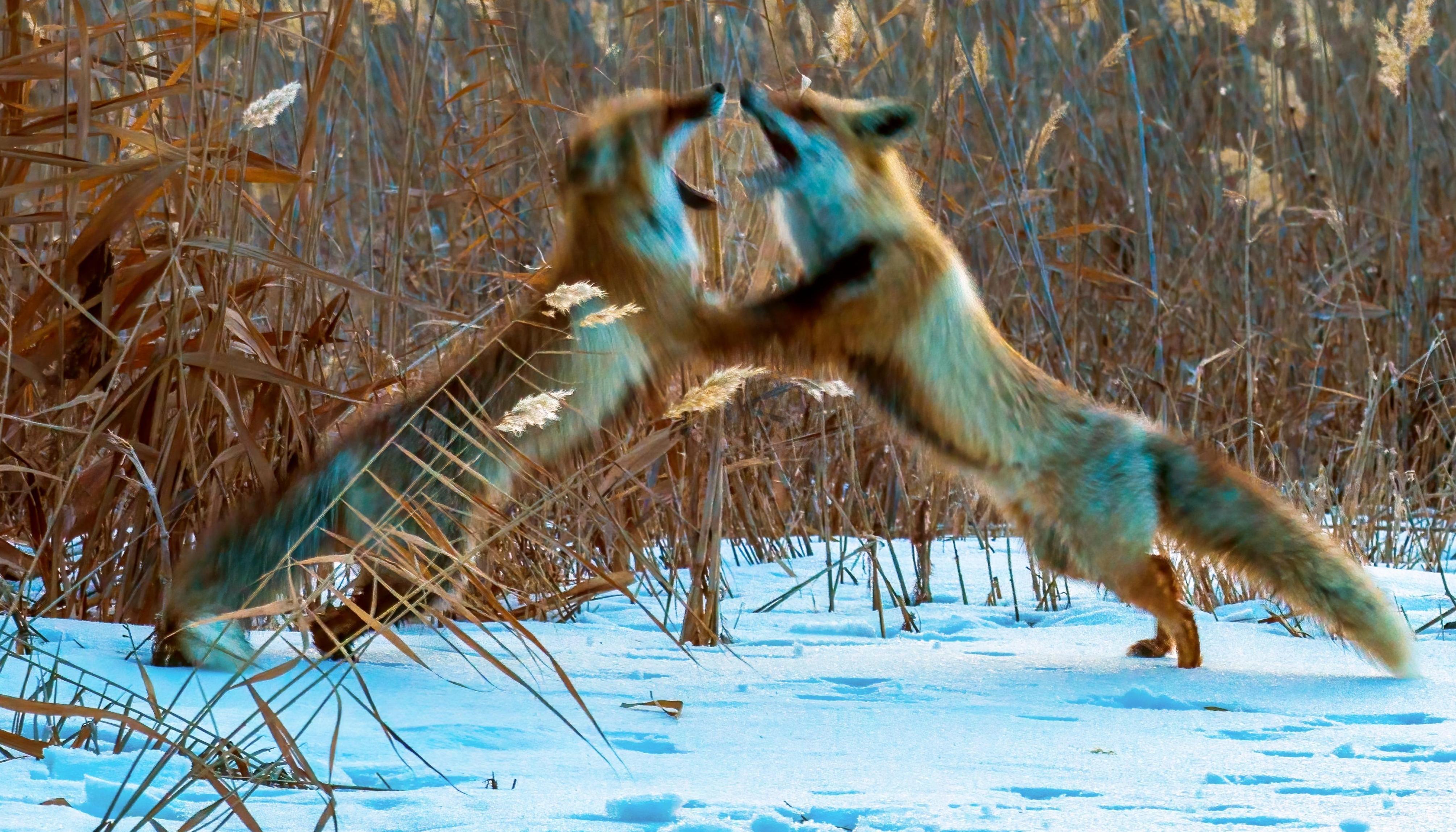 3月8日,古海生态公园内,两只赤狐在冰雪覆盖的湖畔玩耍。今年冬季,市区及近郊的赤狐活动频次明显增多,这与我市生态环境持续改善、市民环保意识不断增强有着直接关系。除赤狐外,鼠、兔、野鸡、隼、鹰等动物也时常在克拉玛依出没,成为我市生态环境持续向好的生动写照。