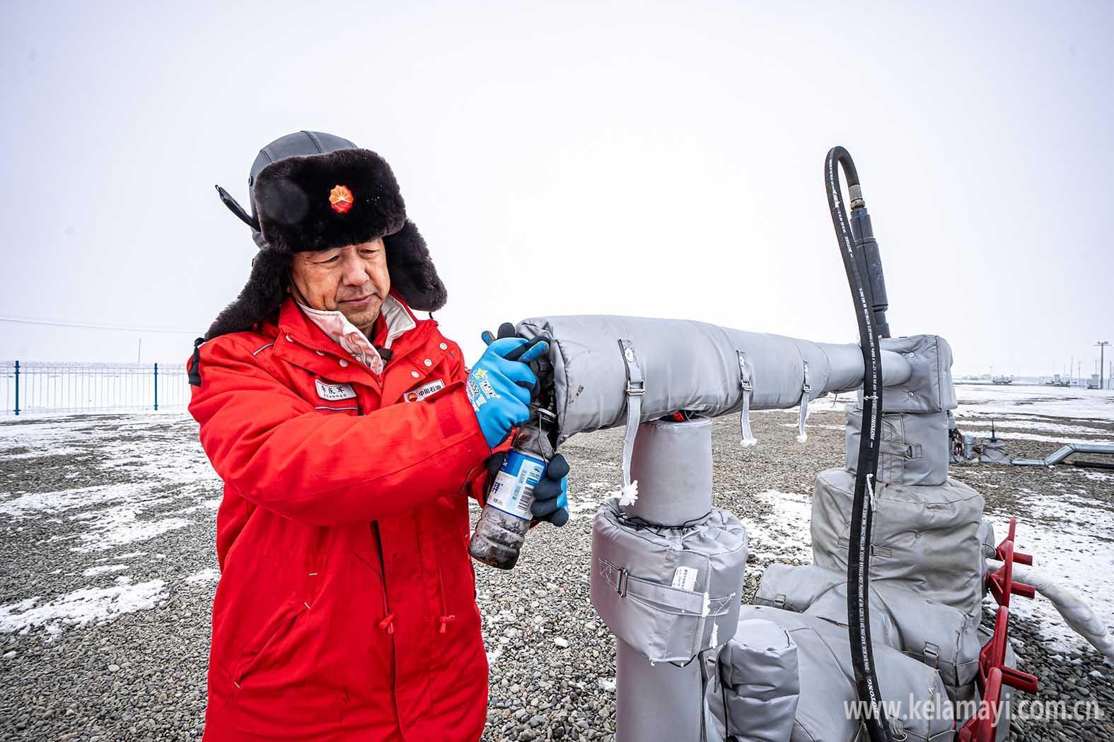 吉庆油田作业区(吉木萨尔页岩油项目经理部)员工在井口取样。新疆石油报记者 徐志远 摄