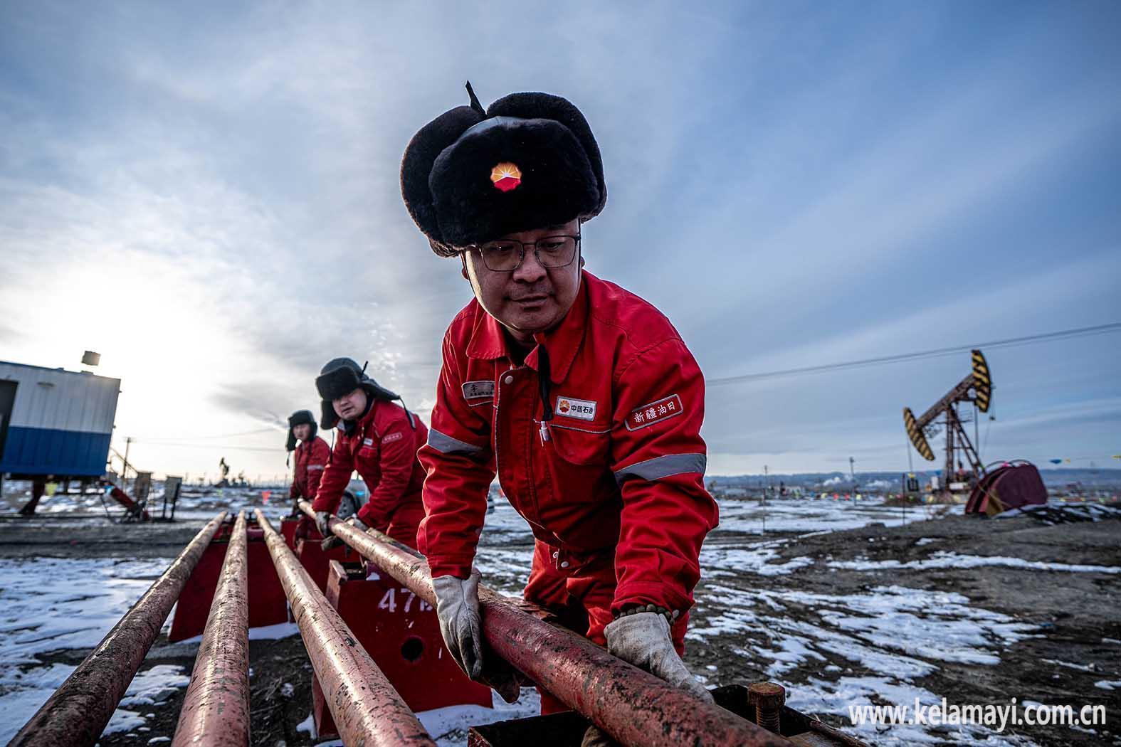 应急抢险救援中心井筒作业分公司员工摆放油管。新疆石油报记者 徐志远 摄