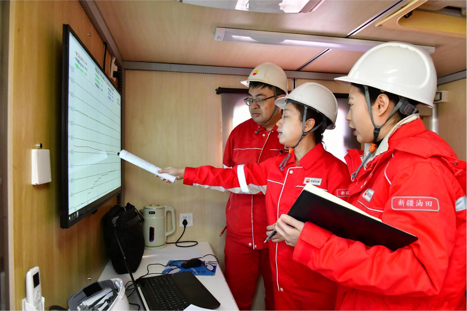 采油工艺研究院(监理公司)科研人员在压裂车上分析施工曲线。裘新农 摄