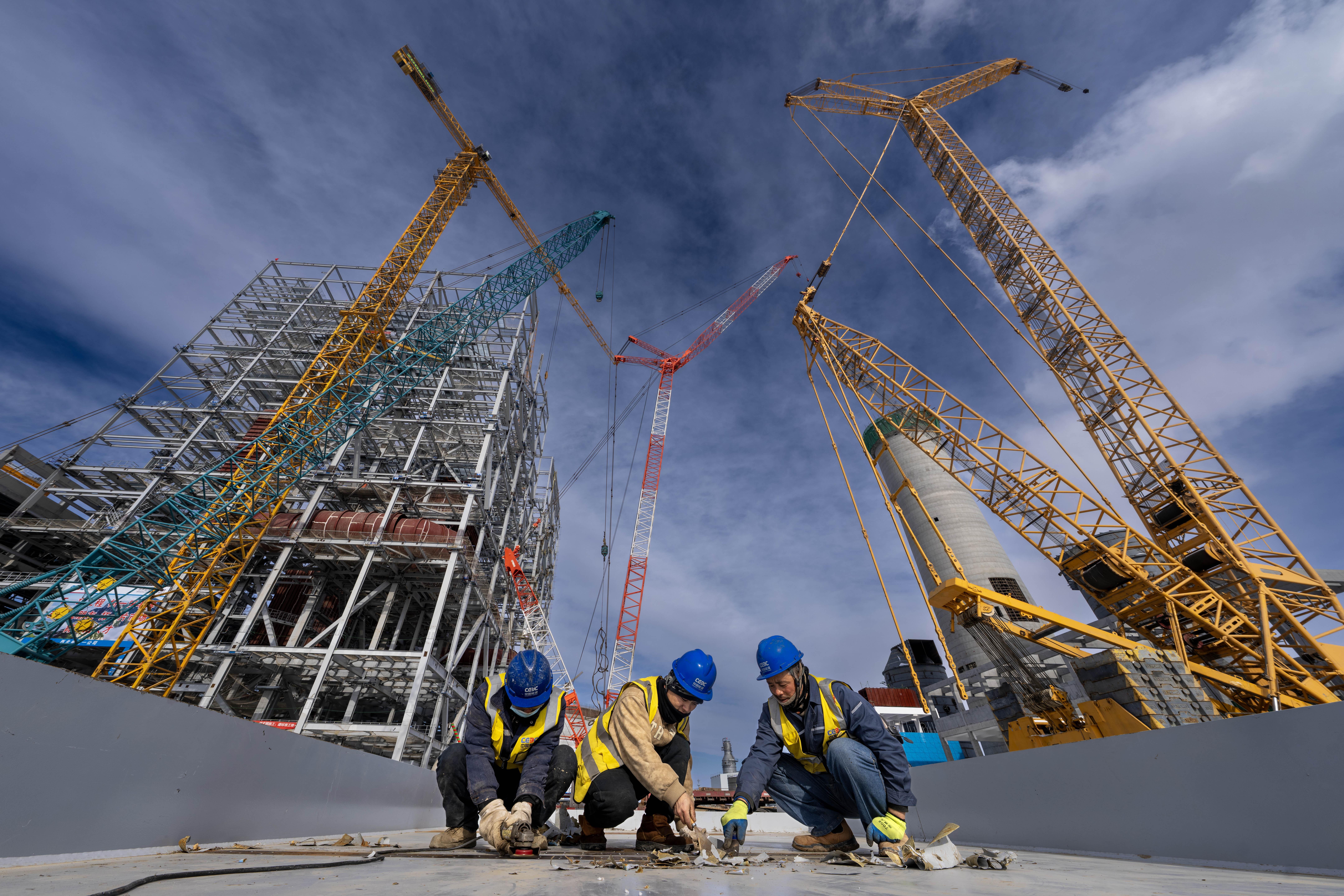 3月10日,新疆油田264万千瓦新能源及配套煤电、碳捕集一体化项目(一期)煤电工程复工,施工人员在锅炉区域开展吊装作业。