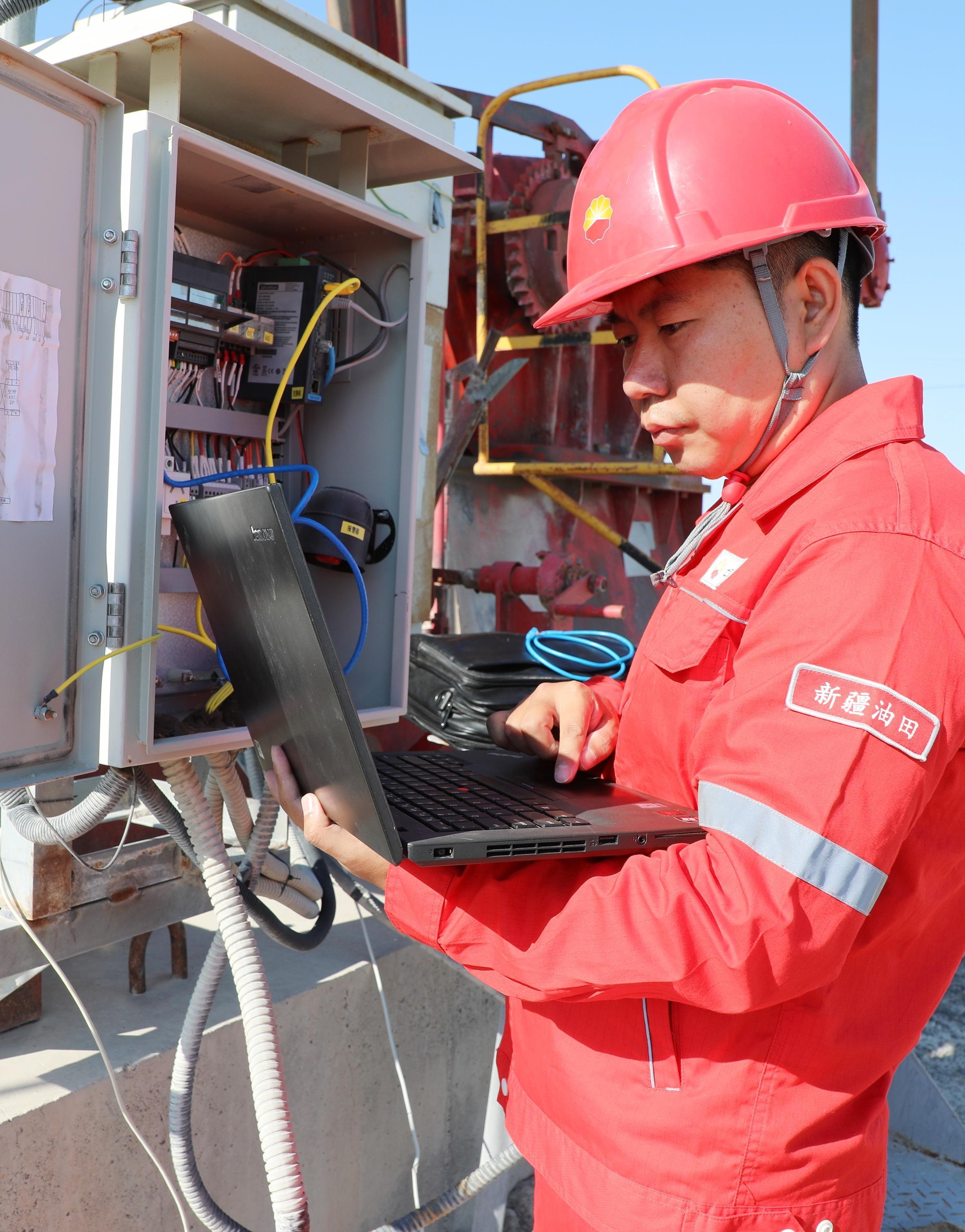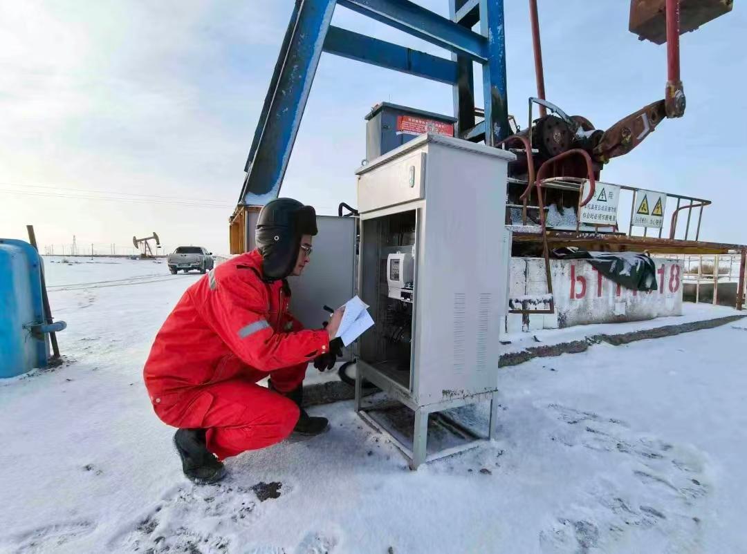 百口泉采油厂员工正在调试新型抽油机智能控制设备,提升低产低效井的管理效率。