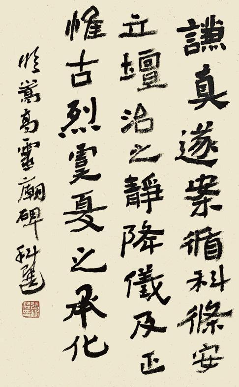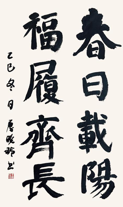 创作思路:这幅作品以颜真卿楷书为宗,目的是让颜体正大雍容的气象与词句中春日的温润生机、福禄绵长的美好祈愿相融合,书写的时候,第一个“春”字是涨墨表现,后面的字顺着笔墨自然书写下去,结构整体宽博大度。