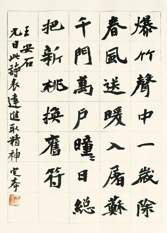 创作思路:《元日》是一首经典的表现春节习俗的诗作。我以魏碑楷书书写这幅书法小品,字径约3厘米,所以作品并不大。书写时注意字的大小对比和纵横之势,字势左低右高,令整幅字不呆板。章法中留下大空,追求 “密不透风,疏可跑马” 的意趣。力求大开大合、静中见动,成就小作品里的大气象。