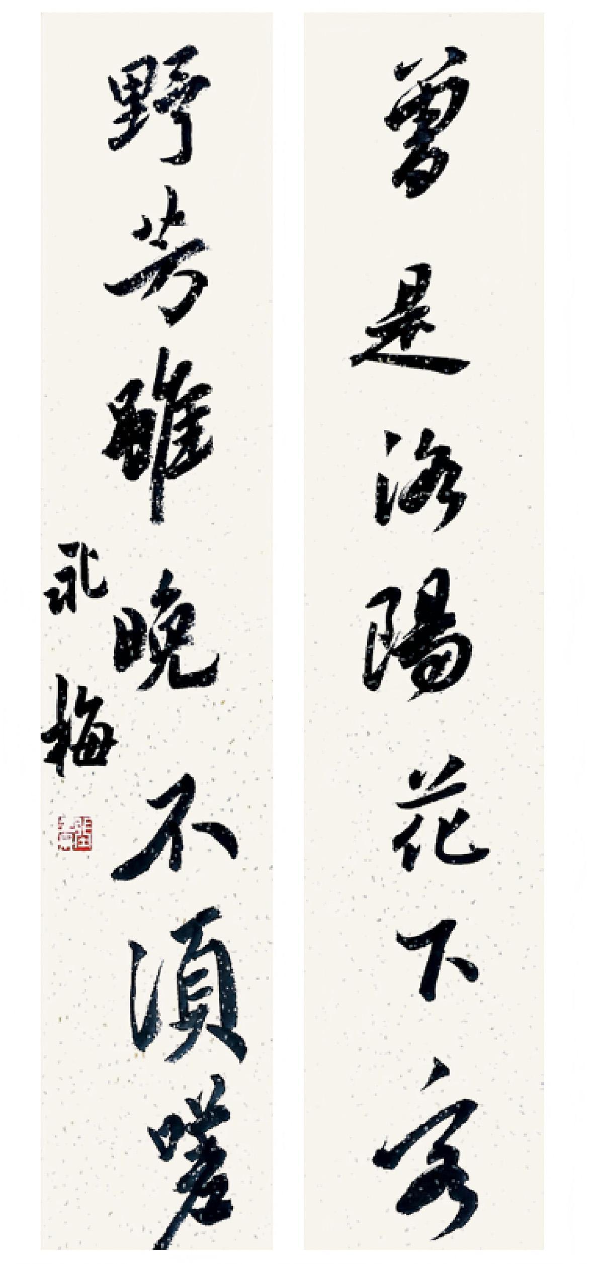 创作思路:恰逢我刚退休,“曾是洛阳花下客,野芳虽晚不须嗟”所传递的意境与我很契合,便选了这两句进行书法创作,创作时力求让作品在飘逸之中包含几分沉稳和古朴,使文字的意境与书法的气韵相融相合。