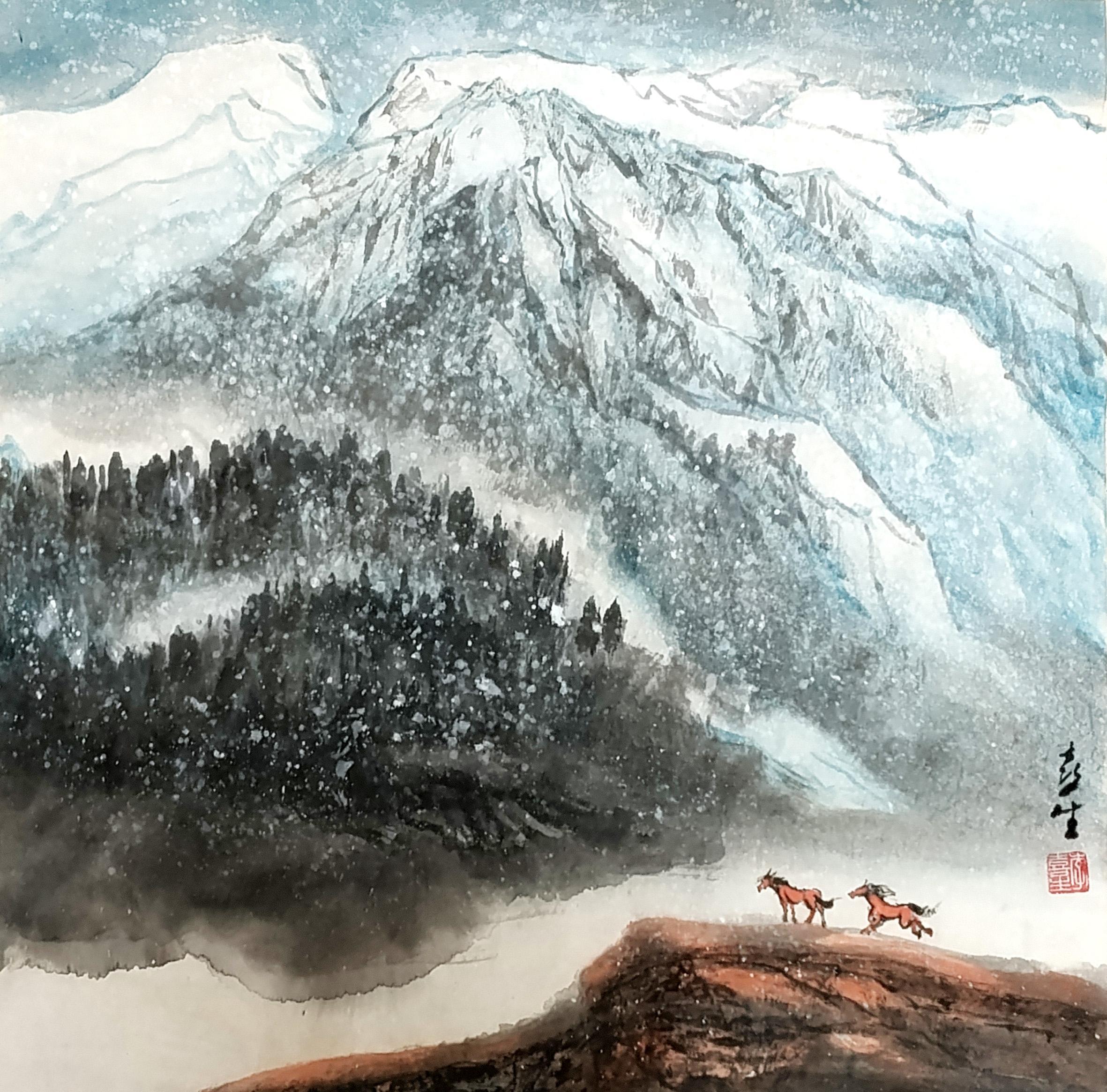 创作思路:我平时主要画胡杨和新疆本土山水,这幅作品创作于冬季,我自然由冬景联想到壮美的天山雪景。恰逢马年,故而我在天山壮阔的背景之下绘就两匹骏马,既展现动物与自然环境休戚与共、不离不弃的共生关系,又将马身绘作赤色,寄寓马年吉祥、喜庆纳福的美好祝愿。