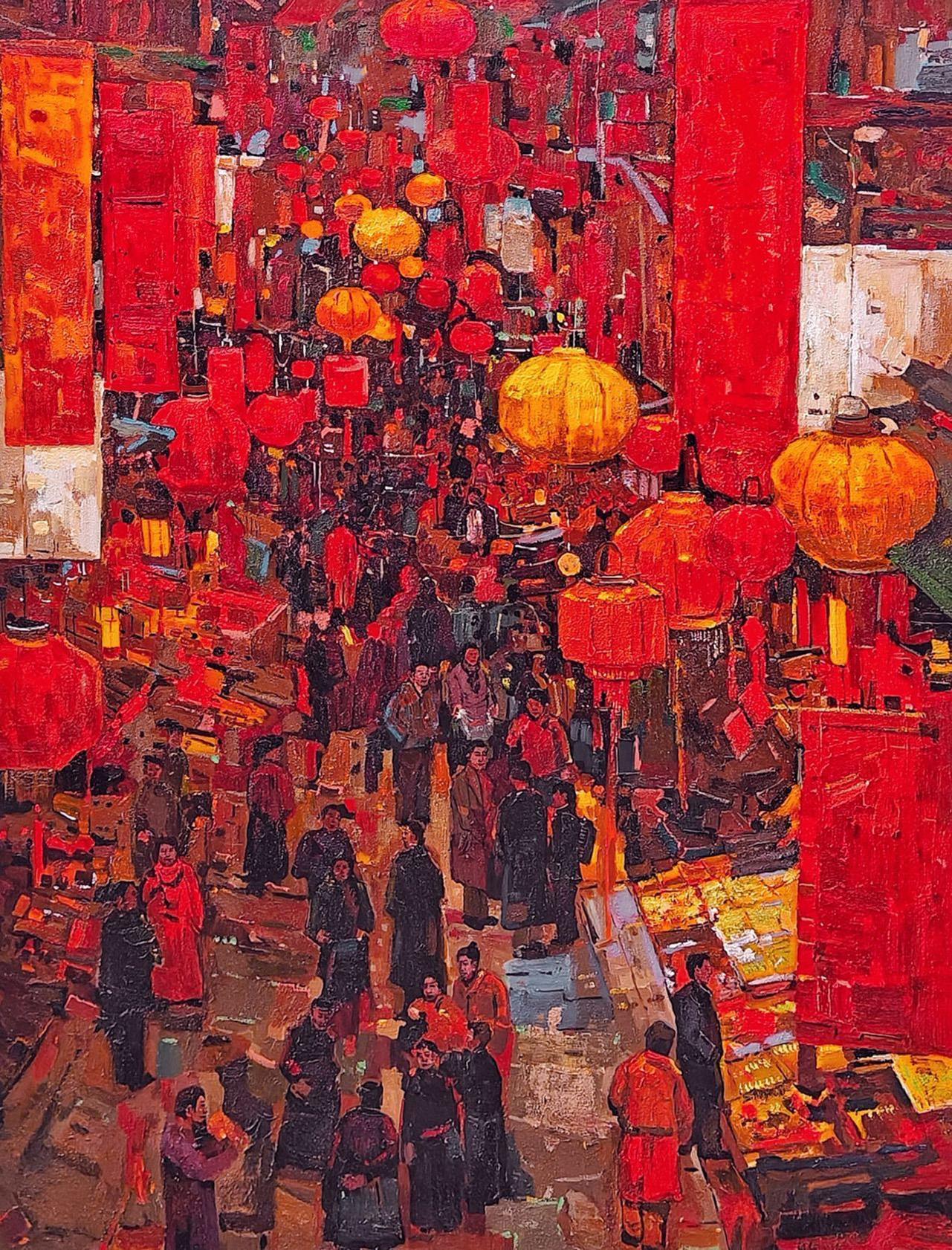 创作思路:创作这幅作品时,我采用红色调烘托新春的热闹氛围,街巷闹市被浓郁年味包裹,红绸与春联沿街铺展、齐整亮眼,在暖融融的人间烟火中尽显新春的欢欣暖意,勾勒出幸福中国年的美好图景。